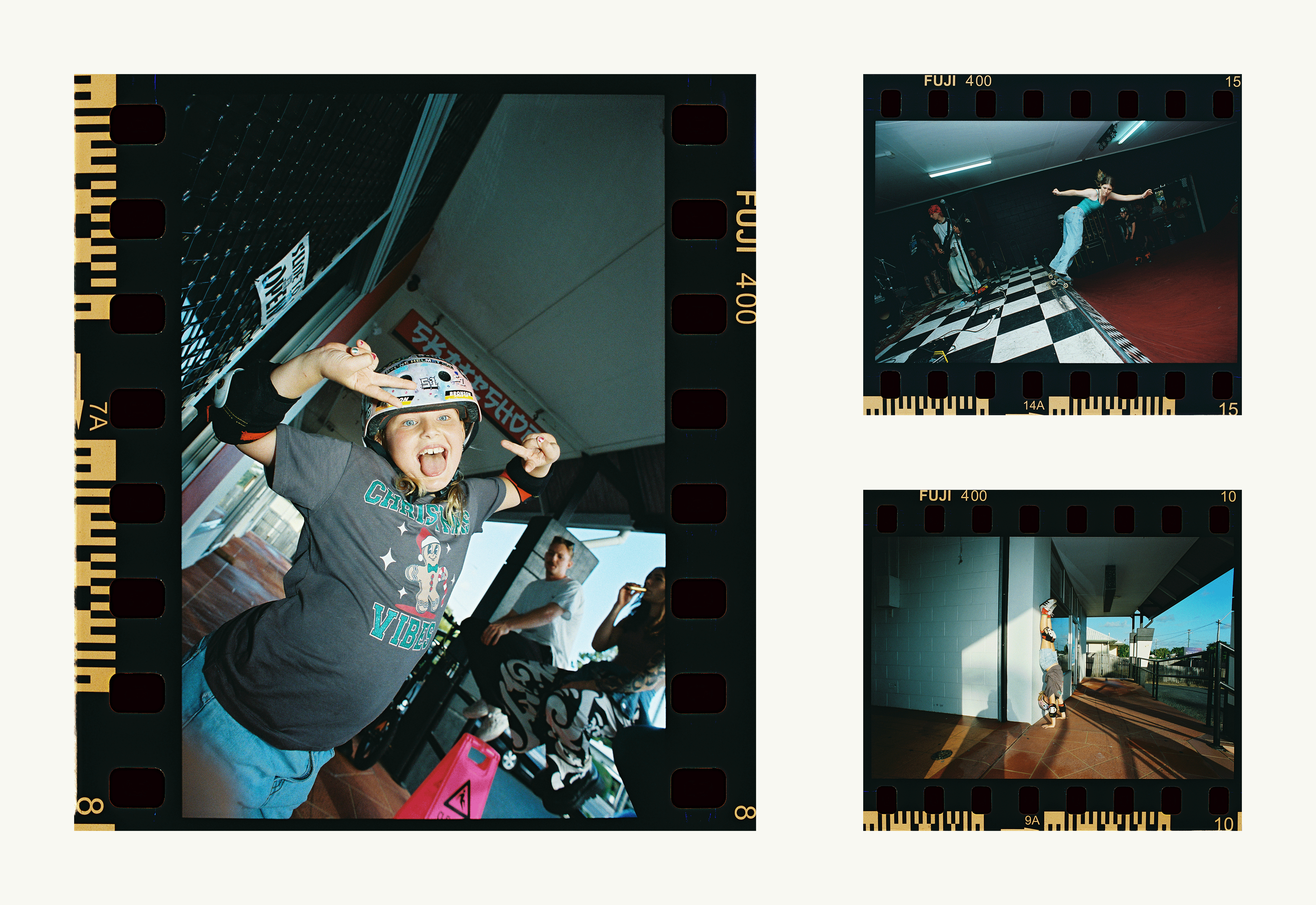 This creates a raw, analogue look that celebrates the physical nature of film. Image colour may vary between frames as scanners balance lighting and account for the added borders.